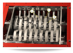 ① 動刀:剪切物料 ② 隔套:控制動刀間隙 ③ 定刀:防止物料纏繞刀軸